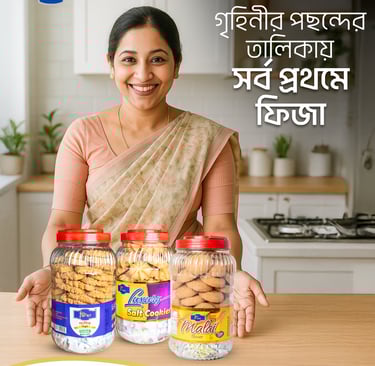 আপনার পরিবারের ছোট-বড় সবার মুখে হাসি ফোটাতে ও স্বাস্থ্যকর নাস্তার নিশ্চয়তা দিতে আজই কিনুন ফিজা বিস্কুট। কারণ, ঘরের পছন্দে প্রথমে আসে ফিজা!